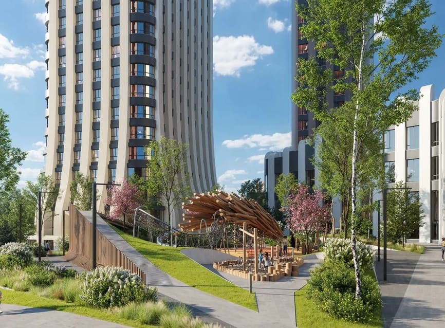 Дворы ЖК ВЕЙВ — это закрытые пространства без автомобилей, спроектированные как места для отдыха, общения и спокойной жизни. В первой очереди реализованы двухуровневые дворы с навесами и смотровыми площадками, во второй — функциональные зоны с современным благоустройством.